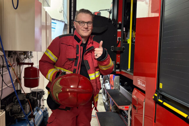Binnen een minuut nadat de pieper is gegaan met pak aan in de brandweerauto zitten: er zijn niet veel brandweervrijwilligers die dat kunnen zeggen. Bas Kosse, vrijwilliger bij Brandweer Harkstede, kan dat wel. Hij woont namelijk pal naast de kazerne.