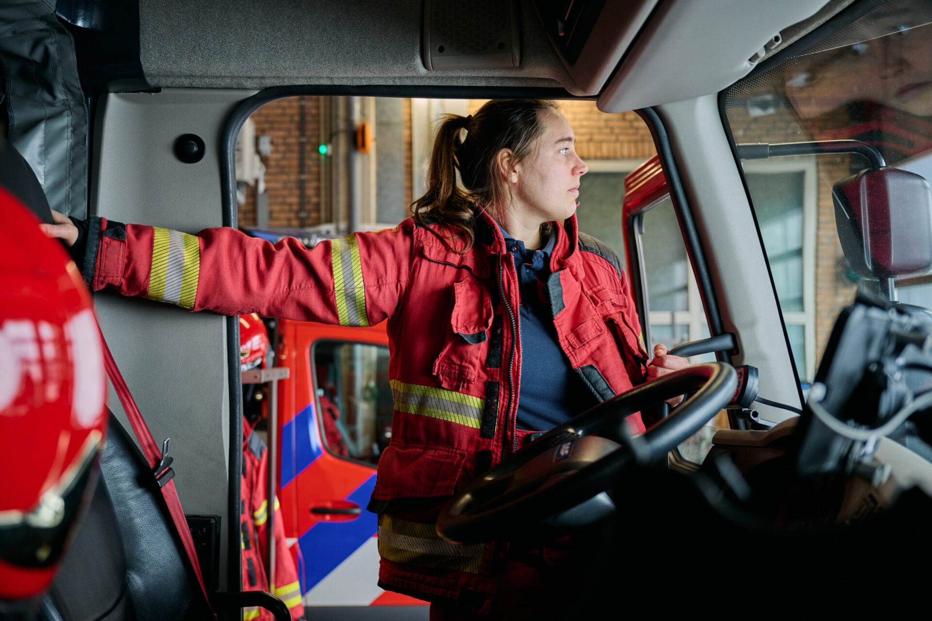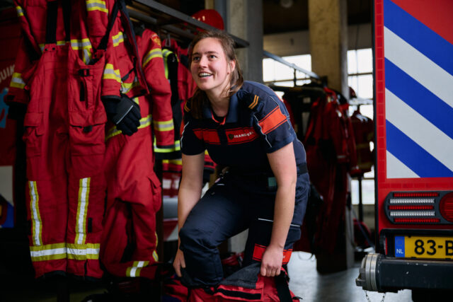 Wie ’s ochtends de kazerne binnenkomt, valt meteen op dat alles rust en routine ademt. Je ruikt de geur van verse koffie en er klinkt gelach en geklets vanaf de grote tafel in de kantine: het is het begin van een 24-uursdienst. Espérence, die nu tweeënhalf jaar bij de beroepsbrandweer in Groningen werkt, is onderdeel van de routine. Het vak van brandweervrouw draait voor haar naast het helpen van mensen óók om het oefenen en 24/7 beschikbaar zijn samen met je ploeg.