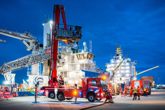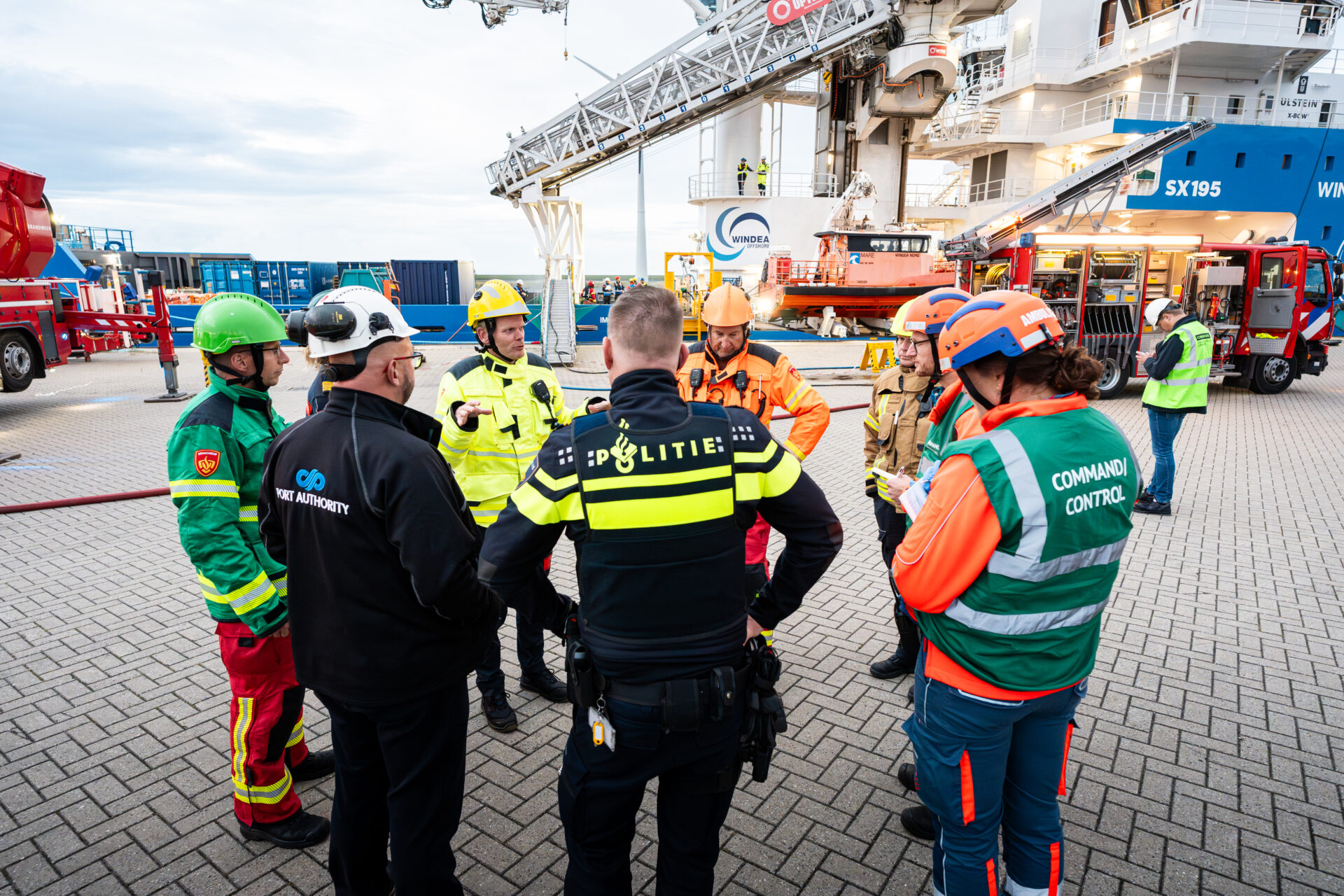 Onder de naam ‘Dubbelvuur’ vond er onlangs een grootschalige brandweeroefening plaats in de Eemshaven. Het scenario: tijdens het overhevelen van methanol – een duurzame maar gevaarlijke brandstof – van het ene naar het andere schip ontstaat er een lekkage, met brand als gevolg. Een brand die zich kan uitbreiden doordat hij relatief laat wordt ontdekt. Een mooie uitdaging voor de gealarmeerde hulpdiensten, waaronder politie, ambulance, brandweer en KNRM.